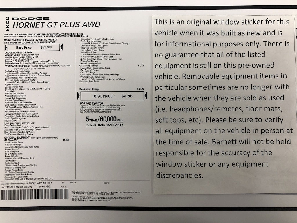 GT BLACKTOP PACKAGE -inc: Gloss Black Painted Day Light Opening Tires: 225/55R18 All Season Wheels: 18" x 7.5" Abyss Finish Aluminum Dark Hornet Badge Goodyear Brand Tires Dark GT Badge Gloss Black Painted Mirror Caps