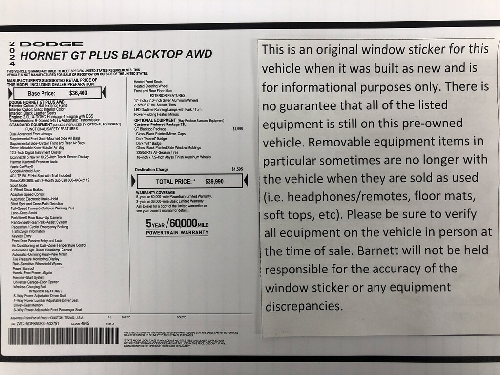 GT BLACKTOP PACKAGE -inc: Gloss Black Painted Day Light Opening Tires: 225/55R18 All Season Wheels: 18" x 7.5" Abyss Finish Aluminum Dark Hornet Badge Dark GT Badge Gloss Black Painted Mirror Caps