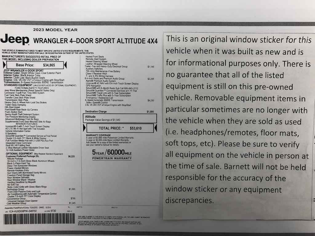 QUICK ORDER PACKAGE 25L ALTITUDE -inc: Engine: 3.6L V6 24V VVT eTorque UPG I Transmission: 8-Speed Automatic (850RE) Speed Sensitive Power Locks Freedom Panel Storage Bag Rear Window Defroster Rear Window Wiper/Washer No Soft Top Automatic Headlamps Altitude Package 110 MPH Vehicle Max Speed Calibration Front 1-Touch Down Power Windows Body Color Grille w/Gloss Black Rings Power Heated Mirrors Black Interior Accents Wizard Black Instrument Panel Bezels Premium Wrapped Steering Wheel Security Alarm Bridgestone Brand Tires Remote Keyless Entry Sun Visors w/Illuminated Vanity Mirrors