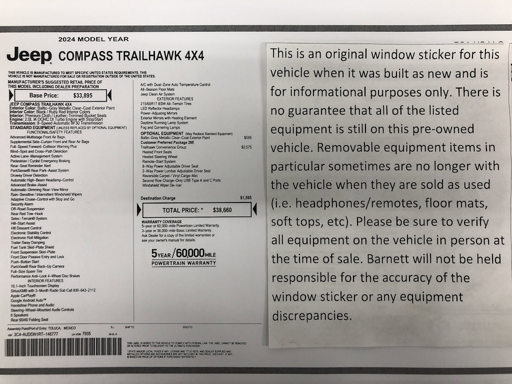 TRAILHAWK CONVENIENCE GROUP -inc: 2nd Row USB Type A/C Charge Only Remote Start System Reversible Carpet/Vinyl Cargo Mat Windshield Wiper De-Icer Heated Front Seats Heated Steering Wheel Power 2-Way Driver Lumbar Adjust