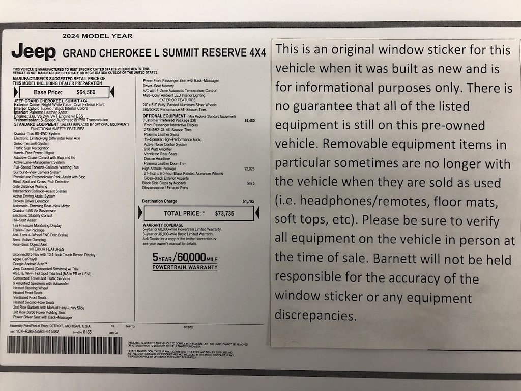 QUICK ORDER PACKAGE 23U SUMMIT RESERVE -inc: Engine: 3.6L V6 24V VVT UPG I w/ESS Transmission: 8-Speed Automatic (8HP50) 950 Watt Amplifier Deluxe Headliner Palermo Leather Door Trim Summit Reserve Badge Ventilated Rear Seats Summit Reserve