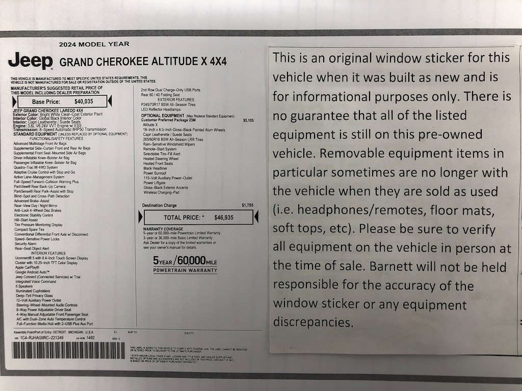 QUICK ORDER PACKAGE 23M ALTITUDE X -inc: Engine: 3.6L V6 24V VVT UPG I w/ESS Transmission: 8-Speed Automatic 8HP50 Altitude X Selectable Tire Fill Alert Remote Start System Rain Sensitive Windshield Wipers Wireless Charging Pad Heated Front Seats Black Headliner Power Sunroof Delete Laredo Badge 115V Auxiliary Power Outlet Gloss Black Exterior Accents Heated Steering Wheel Power Liftgate