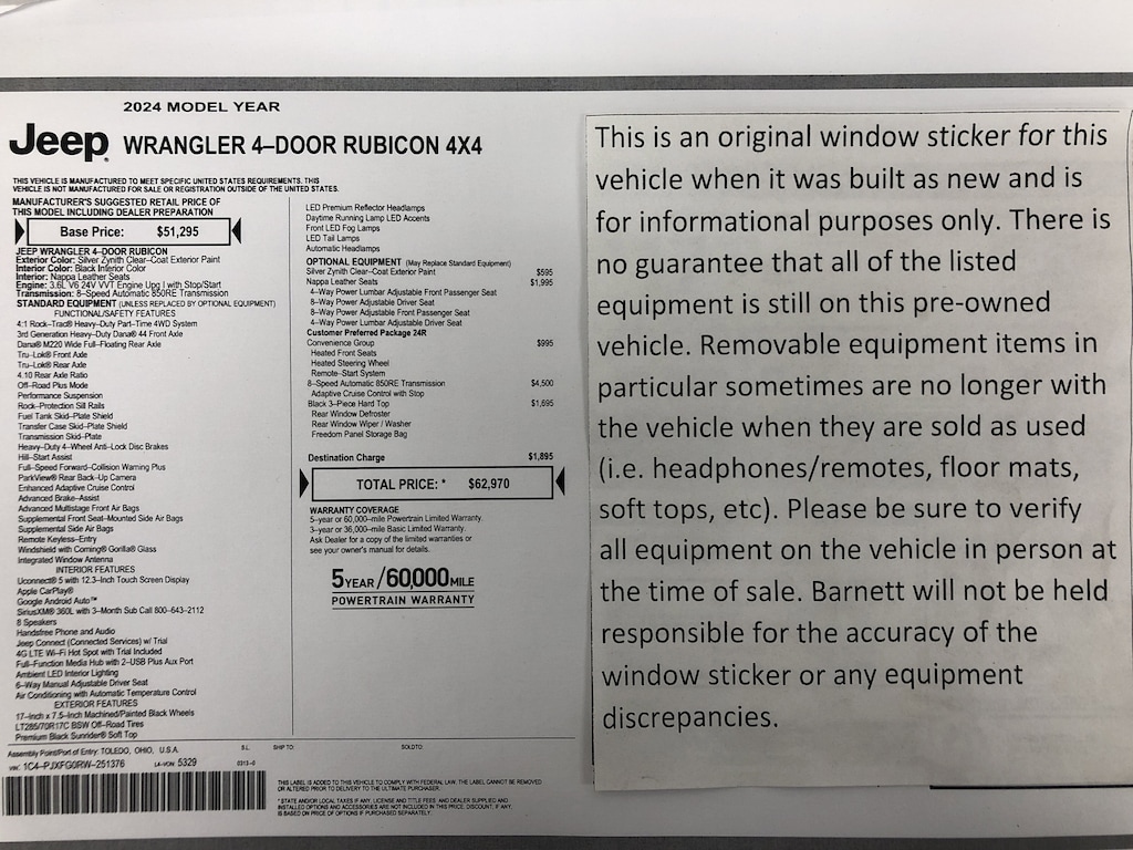 QUICK ORDER PACKAGE 24R RUBICON -inc: Engine: 3.6L V6 24V VVT UPG I w/ESS Transmission: 8-Speed Automatic (850RE)