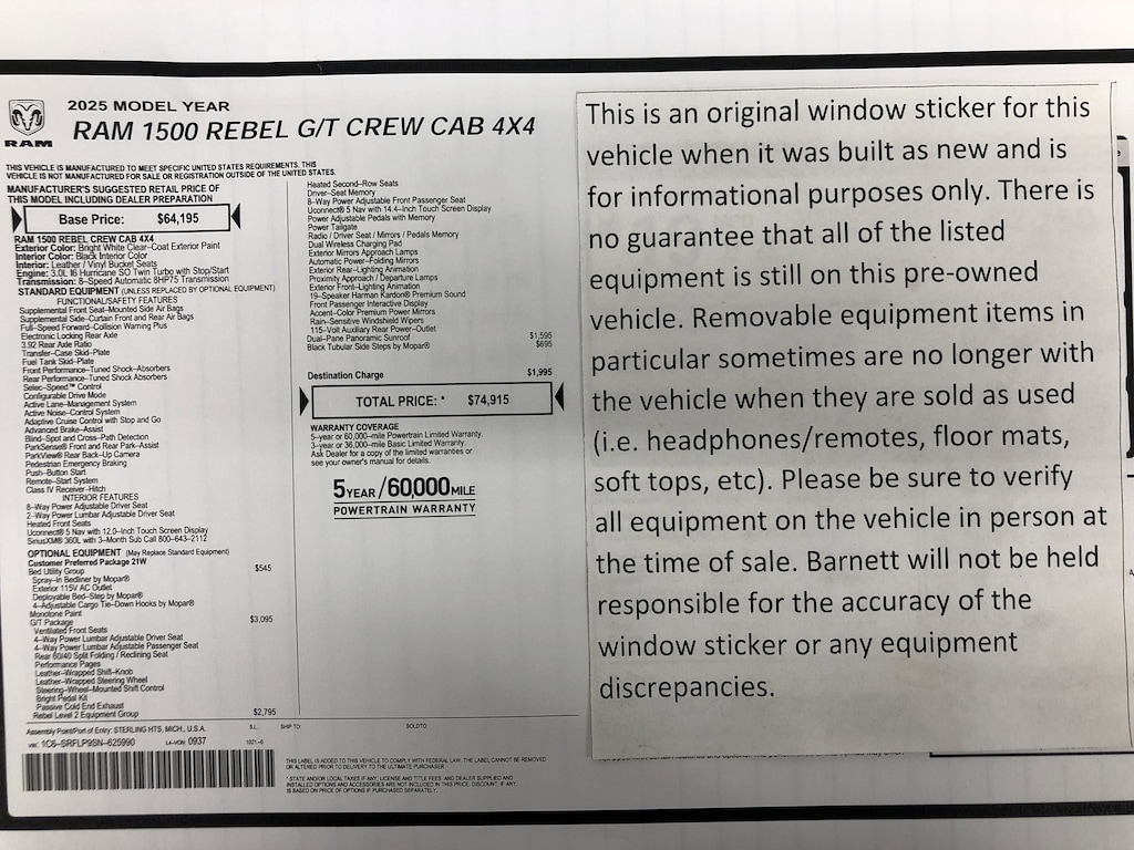 REBEL LEVEL 2 EQUIPMENT GROUP -inc: Rear Window Defroster Rain Sensitive Windshield Wipers Power Adjustable Pedals w/Memory Front Passenger Interactive Display Auto Power-Folding Mirrors 115V Auxiliary Rear Power Outlet Media Hub w/2 Charge Only USBs Proximity Approach/Departure Lamps Auto Dim Exterior Driver Mirror Accent Color Door Handles Heated Second Row Seats Power Adjust 8-Way Front Passenger Seat Security Alarm Black Painted Exterior Mirrors Caps Off-Road Information Pages Exterior Mirrors Approach Lamps HD Radio Smartphone As A Key Capable Accent Color Premium Power Mirrors Dual Wireless Charging Pad Exterior Mirrors w/Supplemental Signals Exterior Mirrors Courtesy Lamps Radio: Uconnect 5 Nav w/14.4" Display harman/kardon 19 Speaker Premium Sound 2-Door Passive Entry Front Door Locks Accent Color Tailgate Handle Exterior Mirrors w/Memory Driver Seat Memory Power Tailgate Radio/Driver Seat/Mirrors/Pedals Memory