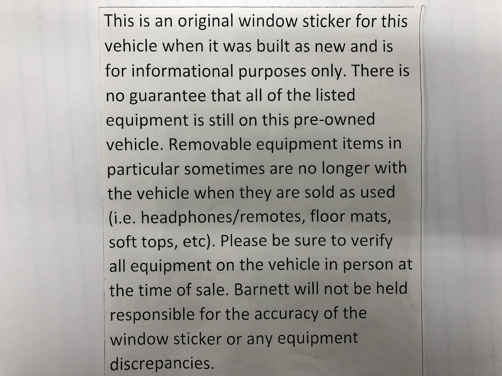 Listed selling price includes a $1000 Barnett Trade Bonus. Trade-in vehicles no more than 10 years old and 100K miles or less with a clean title automatically qualify. Trade-in vehicles outside these parameters need to be discussed and reviewed in person with the dealership to determine qualification. "The vehicle equipment list is auto generated and errors in listed equipment may occur. Please be sure to verify all equipment on the vehicle in person at time of sale as this list may not be 100% accurate. Barnett will not be held responsible for the accuracy of this list."