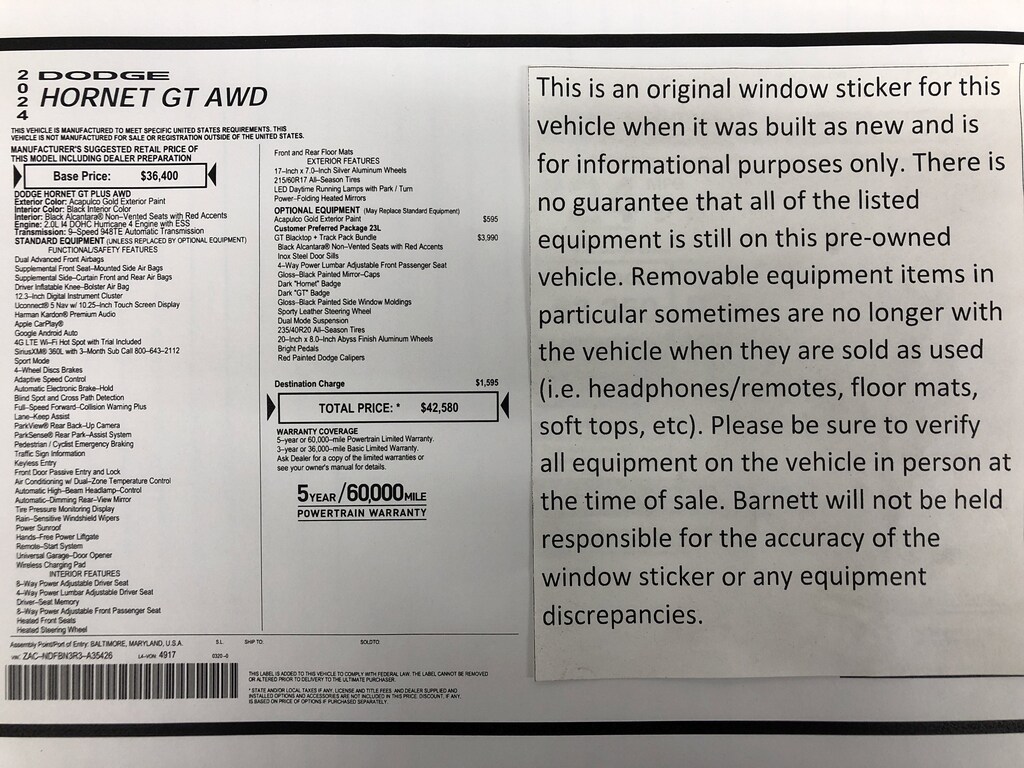 Listed selling price includes a $1000 Barnett Trade Bonus. Trade-in vehicles no more than 10 years old and 100K miles or less with a clean title automatically qualify. Trade-in vehicles outside these parameters need to be discussed and reviewed in person with the dealership to determine qualification. "The vehicle equipment list is auto generated and errors in listed equipment may occur. Please be sure to verify all equipment on the vehicle in person at time of sale as this list may not be 100% accurate. Barnett will not be held responsible for the accuracy of this list."