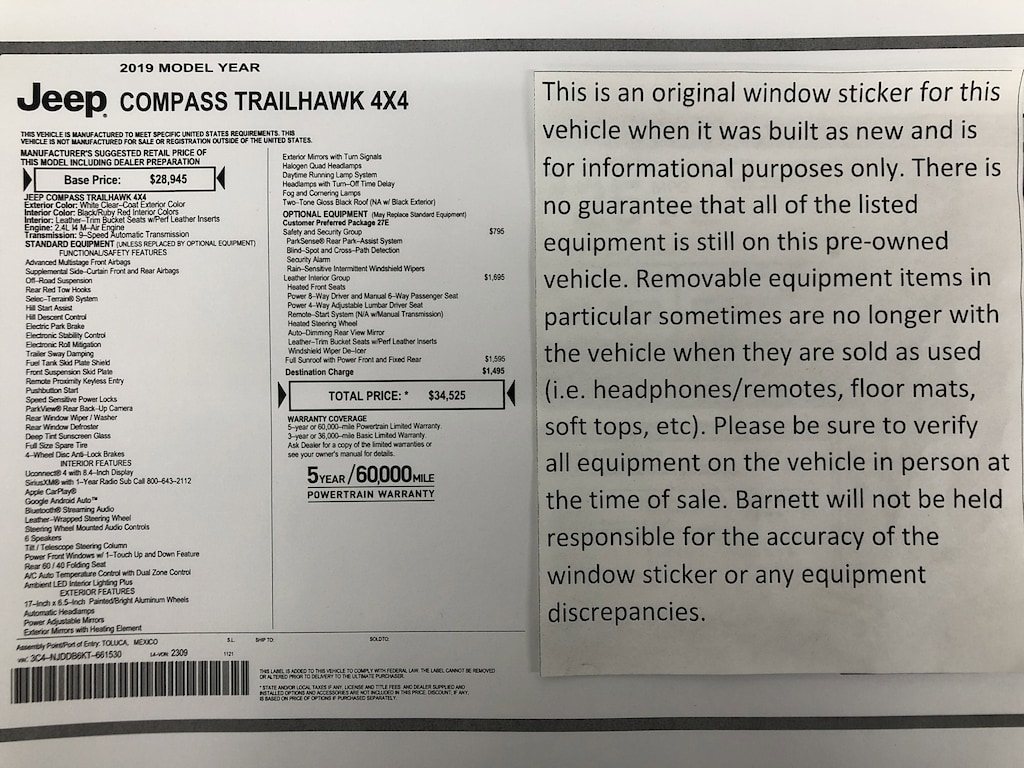 Listed selling price includes a $1000 Barnett Trade Bonus. Trade-in vehicles no more than 10 years old and 100K miles or less with a clean title automatically qualify. Trade-in vehicles outside these parameters need to be discussed and reviewed in person with the dealership to determine qualification. "The vehicle equipment list is auto generated and errors in listed equipment may occur. Please be sure to verify all equipment on the vehicle in person at time of sale as this list may not be 100% accurate. Barnett will not be held responsible for the accuracy of this list."