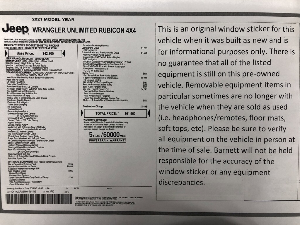 Listed selling price includes a $1000 Barnett Trade Bonus. Trade-in vehicles no more than 10 years old and 100K miles or less with a clean title automatically qualify. Trade-in vehicles outside these parameters need to be discussed and reviewed in person with the dealership to determine qualification. "The vehicle equipment list is auto generated and errors in listed equipment may occur. Please be sure to verify all equipment on the vehicle in person at time of sale as this list may not be 100% accurate. Barnett will not be held responsible for the accuracy of this list."