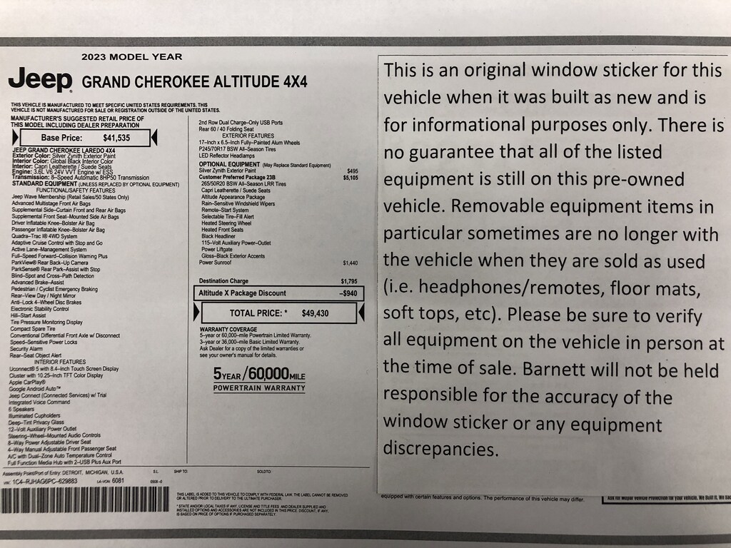 Listed selling price includes a $1000 Barnett Trade Bonus. Trade-in vehicles no more than 10 years old and 100K miles or less with a clean title automatically qualify. Trade-in vehicles outside these parameters need to be discussed and reviewed in person with the dealership to determine qualification. "The vehicle equipment list is auto generated and errors in listed equipment may occur. Please be sure to verify all equipment on the vehicle in person at time of sale as this list may not be 100% accurate. Barnett will not be held responsible for the accuracy of this list."