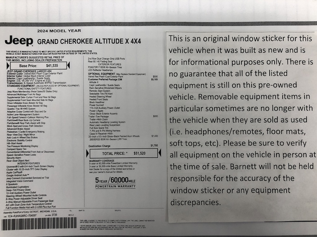 Listed selling price includes a $1000 Barnett Trade Bonus. Trade-in vehicles no more than 10 years old and 100K miles or less with a clean title automatically qualify. Trade-in vehicles outside these parameters need to be discussed and reviewed in person with the dealership to determine qualification. "The vehicle equipment list is auto generated and errors in listed equipment may occur. Please be sure to verify all equipment on the vehicle in person at time of sale as this list may not be 100% accurate. Barnett will not be held responsible for the accuracy of this list."