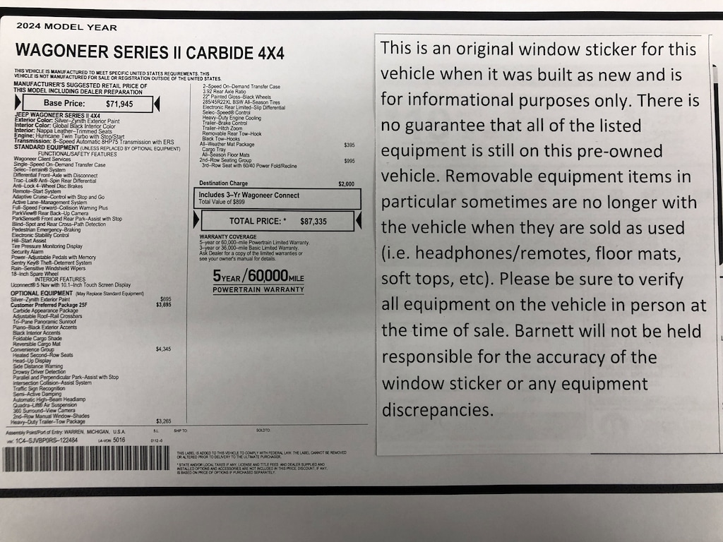 Listed selling price includes a $1000 Barnett Trade Bonus. Trade-in vehicles no more than 10 years old and 100K miles or less with a clean title automatically qualify. Trade-in vehicles outside these parameters need to be discussed and reviewed in person with the dealership to determine qualification. "The vehicle equipment list is auto generated and errors in listed equipment may occur. Please be sure to verify all equipment on the vehicle in person at time of sale as this list may not be 100% accurate. Barnett will not be held responsible for the accuracy of this list."