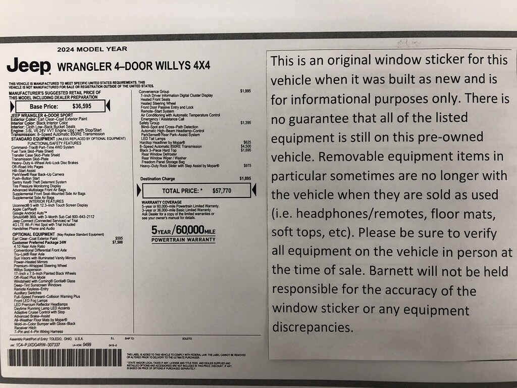 Listed selling price includes a $1000 Barnett Trade Bonus. Trade-in vehicles no more than 10 years old and 100K miles or less with a clean title automatically qualify. Trade-in vehicles outside these parameters need to be discussed and reviewed in person with the dealership to determine qualification. "The vehicle equipment list is auto generated and errors in listed equipment may occur. Please be sure to verify all equipment on the vehicle in person at time of sale as this list may not be 100% accurate. Barnett will not be held responsible for the accuracy of this list."