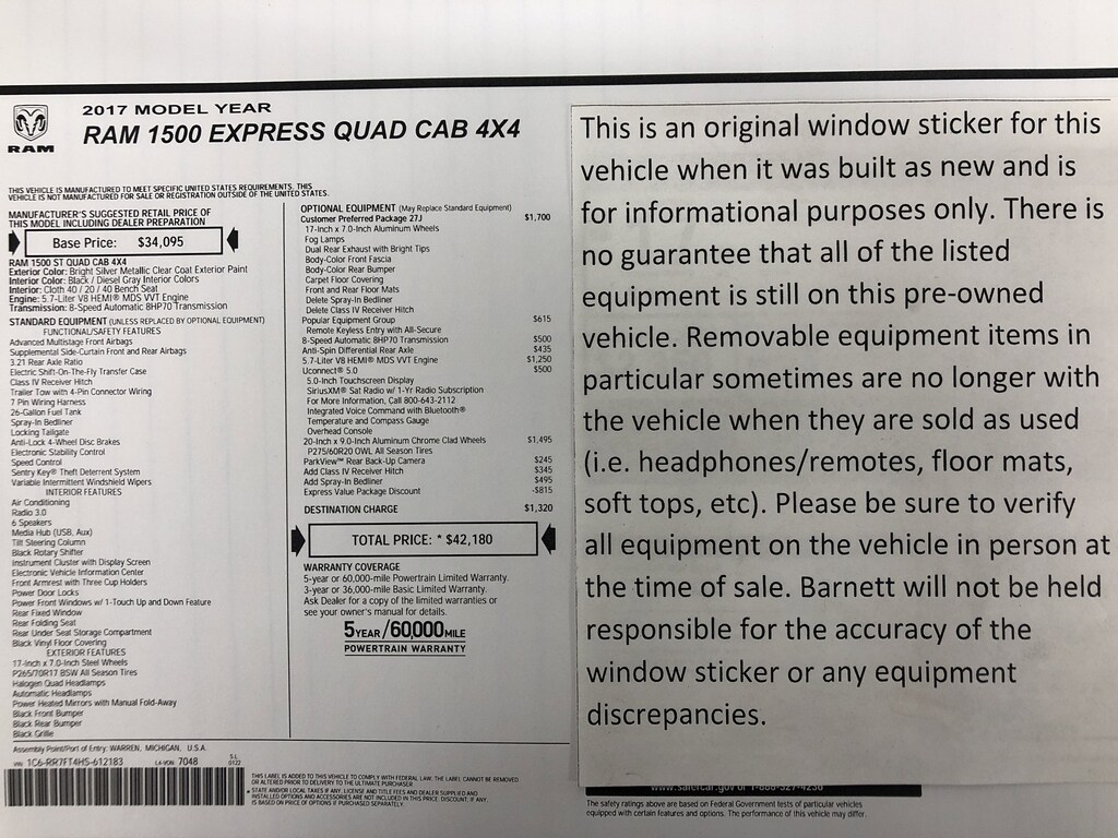 Listed selling price includes a $1000 Barnett Trade Bonus. Trade-in vehicles no more than 10 years old and 100K miles or less with a clean title automatically qualify. Trade-in vehicles outside these parameters need to be discussed and reviewed in person with the dealership to determine qualification. "The vehicle equipment list is auto generated and errors in listed equipment may occur. Please be sure to verify all equipment on the vehicle in person at time of sale as this list may not be 100% accurate. Barnett will not be held responsible for the accuracy of this list."